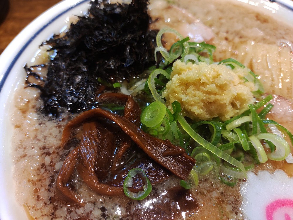 具材は岩のり、メンマ、ネギにナルト、そして生姜がトッピングされています。