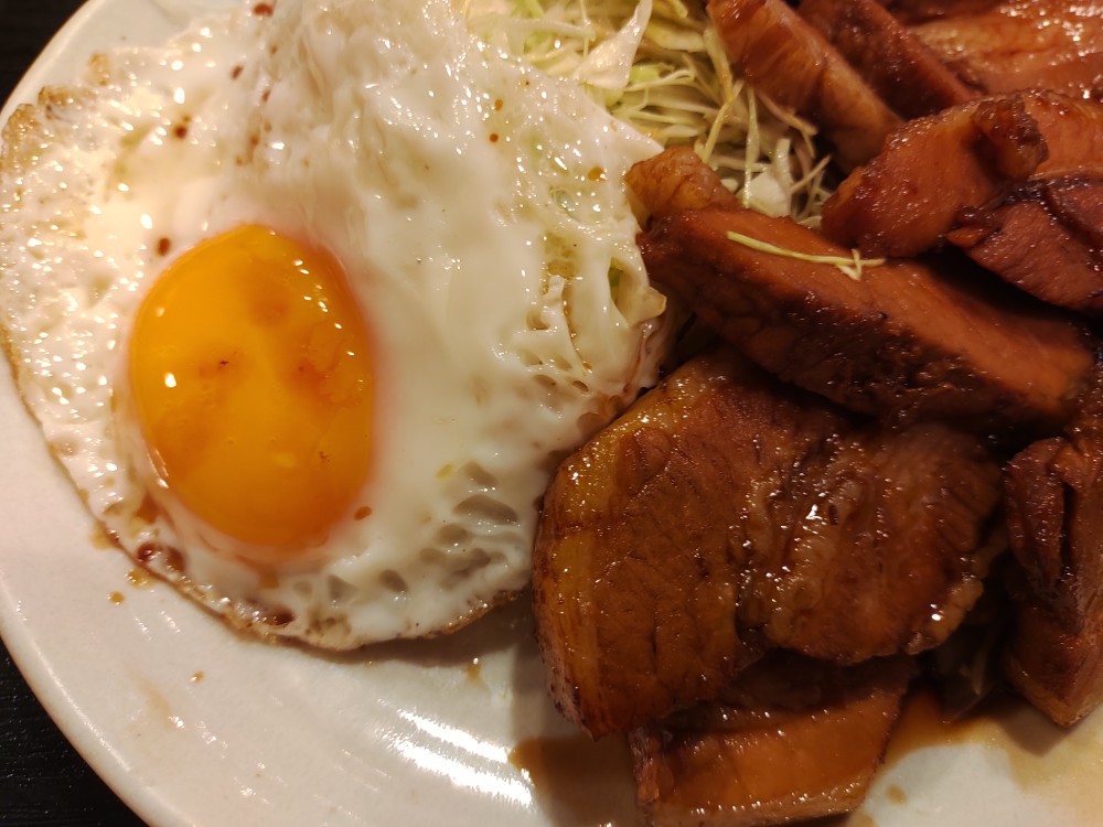 目玉焼きもあるので卵黄を付けたり、卵白とタレを絡めてチャーシューと一緒に頬張ったりとバリエーション豊富な食べ方があります。