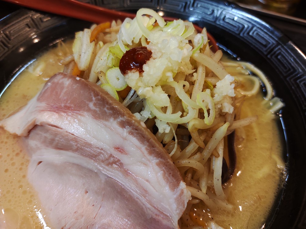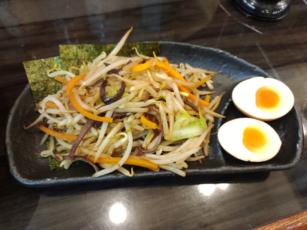 こちらは野菜が通常の2.5倍なのに加え、味玉と海苔が2枚付きます。