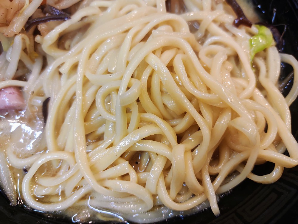 麺は中太麺で、モッチリしていますが、加水率は低めで噛むとボソボソとした食感が残りました。