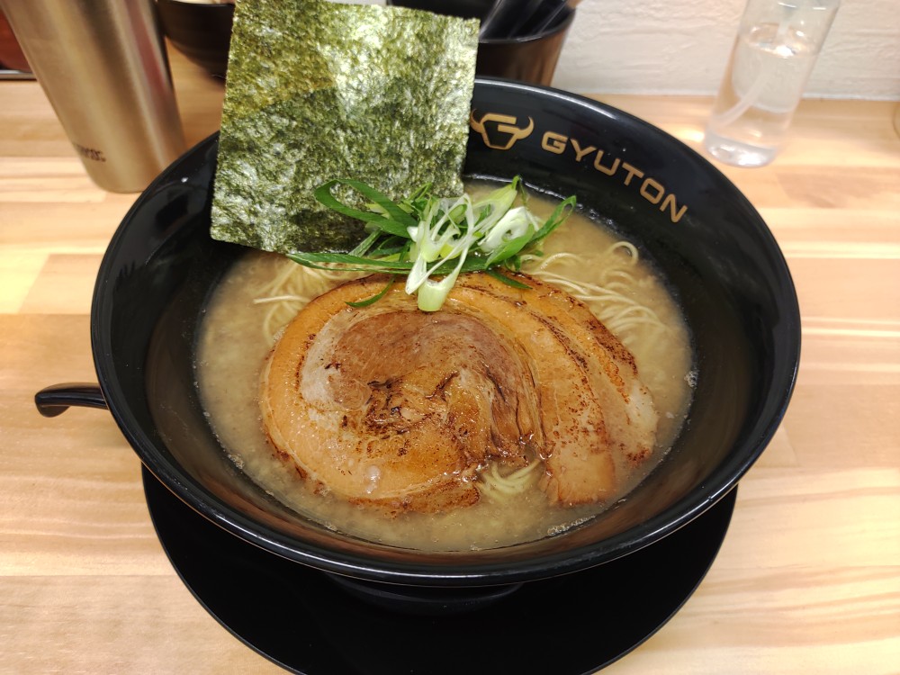 ★★★★★★☆☆☆☆ 聖蹟桜ヶ丘駅から3分程のところにある、飲食店街の奥にある「GYUTON」。 2022年10月に10年営業した国分寺から移転してきたお店で、まだオープンから1年しか経っていません。 今回は「牛豚骨醤油ラーメン」を選択しました。 食券を渡す際に麺の...